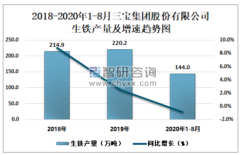 2018-2020年1-8月三宝集团股份有限公司生铁产量及增速趋势图