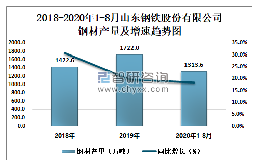 2018-2020年1-8月山东钢铁股份有限公司钢材产量及增速趋势图