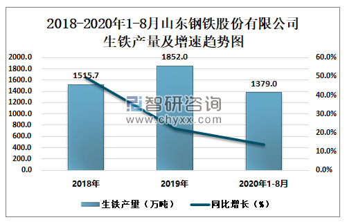 2018-2020年1-8月山东钢铁股份有限公司生铁产量及增速趋势图