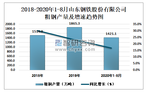 根据冶金工业信息中心数据显示:2020年1-8月山东钢铁股份有限公司钢材产量为1313.6万吨,同比增长18.4%;粗钢产量为1421.1万吨,同比增长16.9%;生铁产量为1379.0万吨,同比增长13.6%。