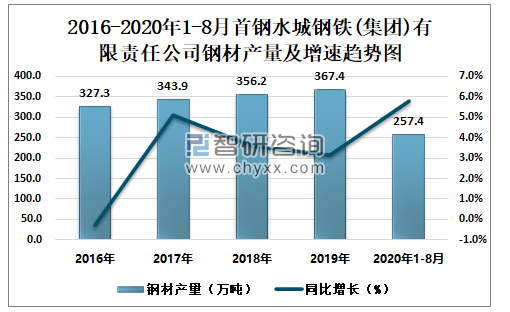 2016-2020年1-8月首钢水城钢铁(集团)有限责任公司钢材产量及增速趋势图