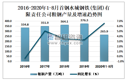 根据冶金工业信息中心数据显示:2020年1-8月首钢水城钢铁(集团)有限责任公司钢材产量为257.4万吨,同比增长5.8%;粗钢产量为265.9万吨,同比增长6.6%;生铁产量为239.6万吨,同比增长5.4%。