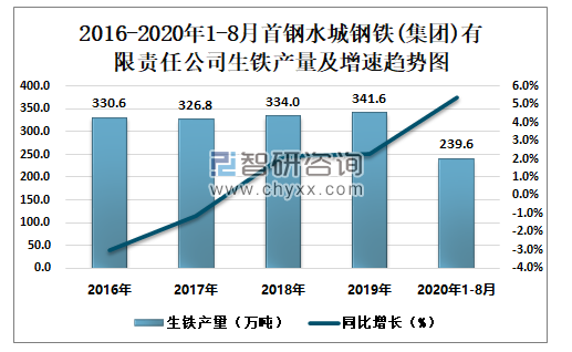 2016-2020年1-8月首钢水城钢铁(集团)有限责任公司生铁产量及增速趋势图