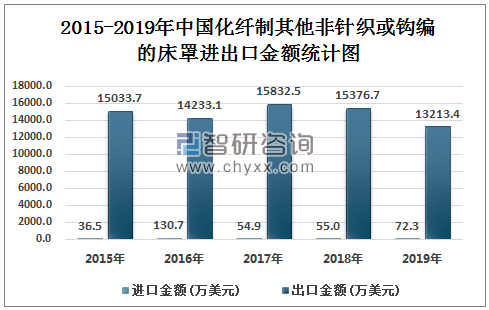 2015-2019年中国化纤制其他非针织或钩编的床罩 进出口金额统计图