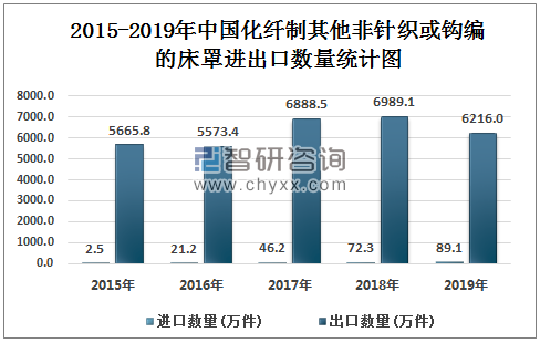 根据中国海关数据显示:2019年1-12月中国化纤制其他非针织或钩编的床罩进口数量为89.1万件,进口金额为72.3万美元;2019年1-12月中国化纤制其他非针织或钩编的床罩出口数量为6216.0万件,出口金额为13213.4万美元。