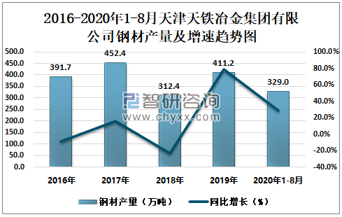 2016-2020年1-8月天津天铁冶金集团有限公司钢材产量及增速趋势图