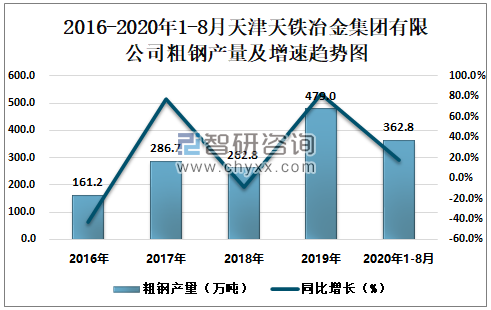 根据冶金工业信息中心数据显示:2020年1-8月天津天铁冶金集团有限公司钢材产量为329.0万吨,同比增长28.3%;粗钢产量为362.8万吨,同比增长17.3%;生铁产量为335.8万吨,同比增长19.3%。