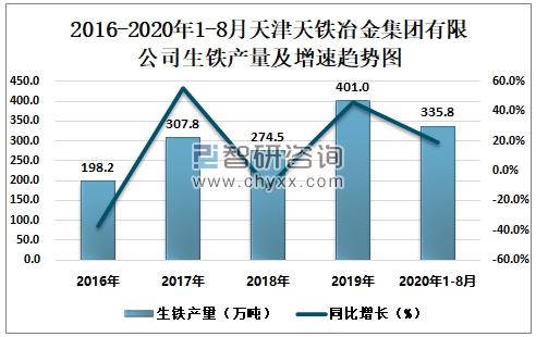 2016-2020年1-8月天津天铁冶金集团有限公司生铁产量及增速趋势图