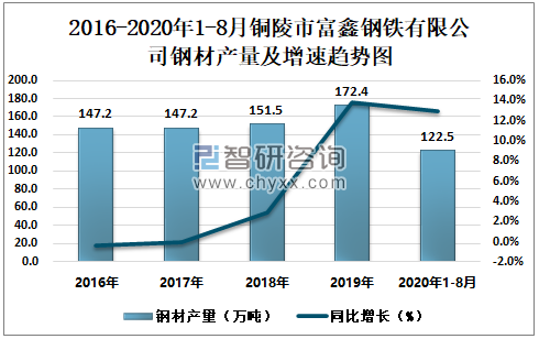 2016-2020年1-8月铜陵市富鑫钢铁有限公司钢材产量及增速趋势图