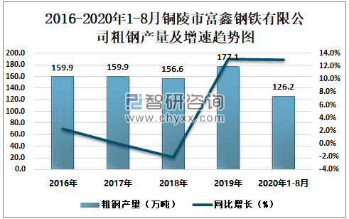 根据冶金工业信息中心数据显示:2020年1-8月铜陵市富鑫钢铁有限公司钢材产量为122.5万吨,同比增长12.9%;粗钢产量为126.2万吨,同比增长13%;生铁产量为114.3万吨,同比增长9.8%。