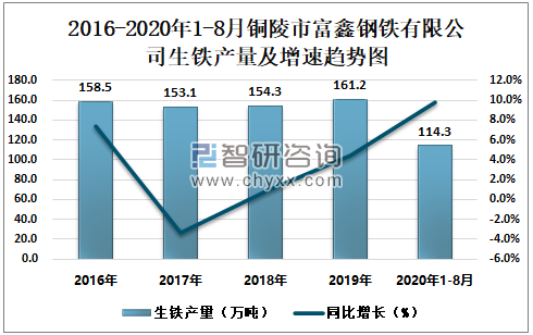 2016-2020年1-8月铜陵市富鑫钢铁有限公司生铁产量及增速趋势图