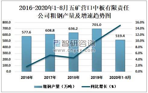 2016-2020年1-8月五矿营口中板有限责任公司粗钢产量及增速趋势图