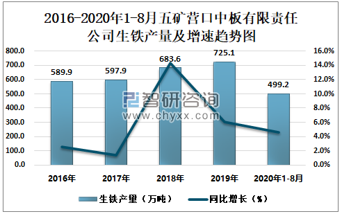 2016-2020年1-8月五矿营口中板有限责任公司生铁产量及增速趋势图