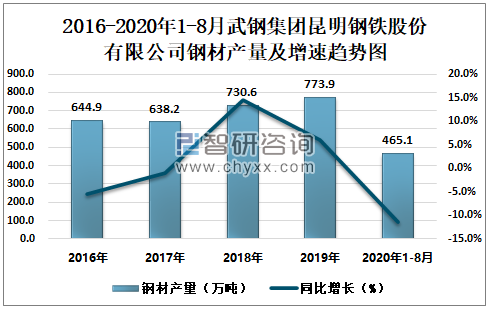 2016-2020年1-8月武钢集团昆明钢铁股份有限公司钢材产量及增速趋势图