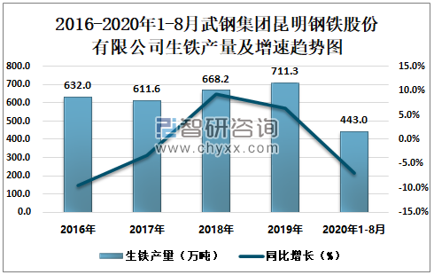 2016-2020年1-8月武钢集团昆明钢铁股份有限公司生铁产量及增速趋势图