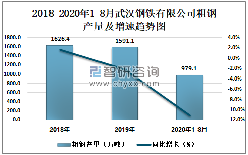 根据冶金工业信息中心数据显示:2020年1-8月武汉钢铁有限公司钢材产量为862.6万吨,同比下降15.8%;粗钢产量为979.1万吨,同比下降11.1%;生铁产量为936.4万吨,同比下降12.6%。