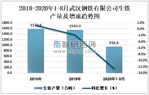 2018-2020年1-8月武汉钢铁有限公司生铁产量及增速趋势图
