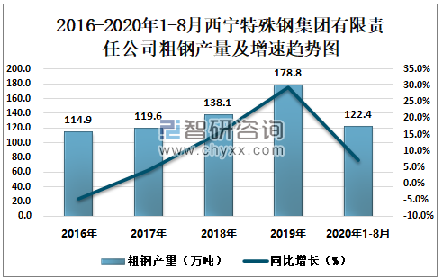 2016-2020年1-8月西宁特殊钢集团有限责任公司粗钢产量及增速趋势图