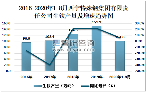 2016-2020年1-8月西宁特殊钢集团有限责任公司生铁产量及增速趋势图