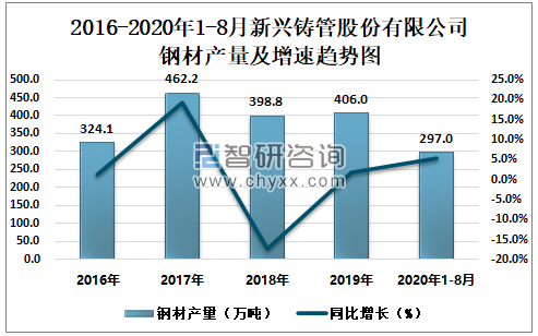 根据冶金工业信息中心数据显示:2020年1-8月新兴铸管股份有限公司钢材产量为297.0万吨,同比增长5.4%;粗钢产量为287.4万吨,同比增长2.3%;生铁产量为403.8万吨,同比增长6.7%。