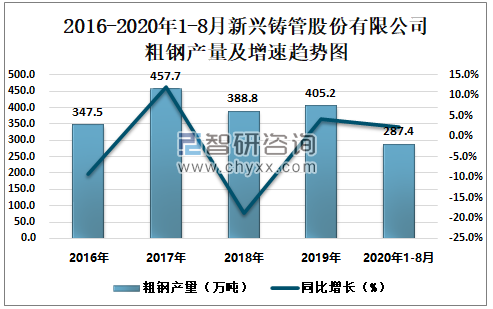 2016-2020年1-8月新兴铸管股份有限公司粗钢产量及增速趋势图