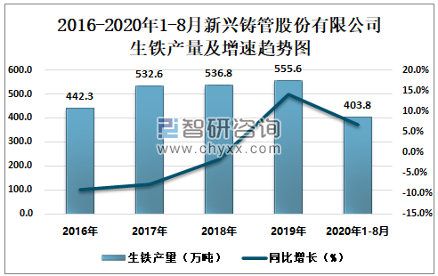 2016-2020年1-8月新兴铸管股份有限公司生铁产量及增速趋势图