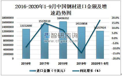 2016-2020年1-9月中国钢材进口金额及增速趋势图