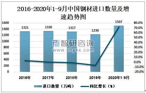 根据中国海关数据显示:2020年1-9月中国钢材进口数量为1507万吨,同比增长72.2%;2020年1-9月中国钢材进口金额为12257914千美元,同比增长18%。