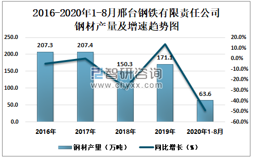 2016-2020年1-8月邢台钢铁有限责任公司钢材产量及增速趋势图