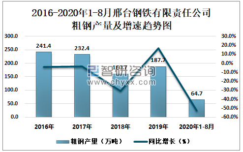 2016-2020年1-8月邢台钢铁有限责任公司粗钢产量及增速趋势图
