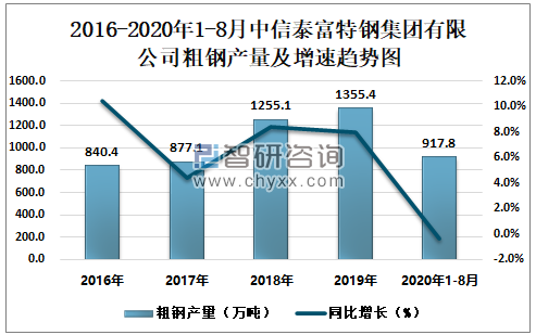 2016-2020年1-8月中信泰富特钢集团有限公司粗钢产量及增速趋势图
