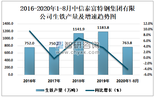 2016-2020年1-8月中信泰富特钢集团有限公司生铁产量及增速趋势图