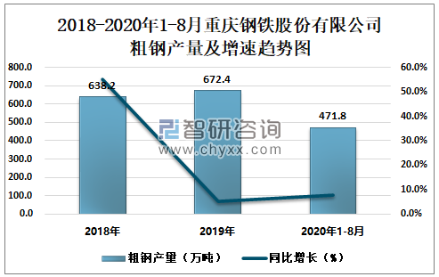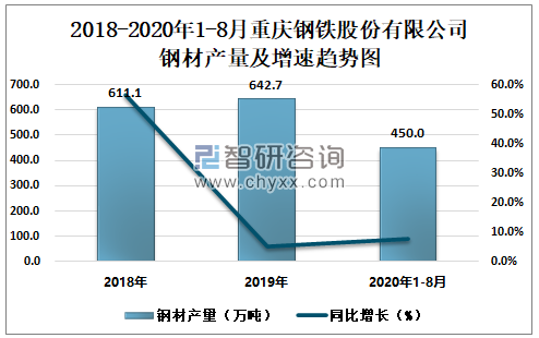 根据冶金工业信息中心数据显示:2020年1-8月重庆钢铁股份有限公司钢材产量为450.0万吨,同比增长7.7%;粗钢产量为471.8万吨,同比增长7.6%;生铁产量为402.3万吨,同比增长0.5%。