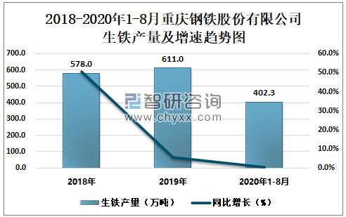 2018-2020年1-8月重庆钢铁股份有限公司生铁产量及增速趋势图