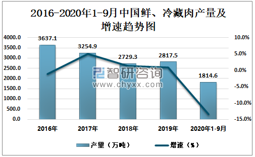 根据国家统计局数据显示:2020年9月中国鲜、冷藏肉产量为228.9万吨,同比增长3.6%;2020年1-9月中国鲜、冷藏肉产量为1814.6万吨,同比下降13.4%。