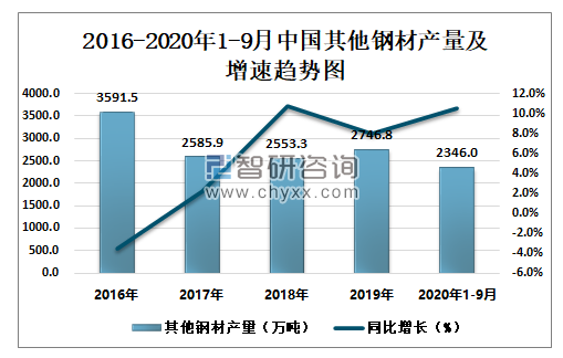 2016-2020年1-9月中国其他钢材产量及增速趋势图