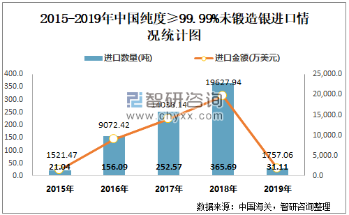 根据中国海关数据显示:2019年1-12月中国纯度≥99.99%未锻造银进口数量为31.11吨,进口金额为1757.06万美元;2019年1-12月纯度≥99.99%未锻造银出口数量为2394.39吨,出口金额为123720.97万美元。