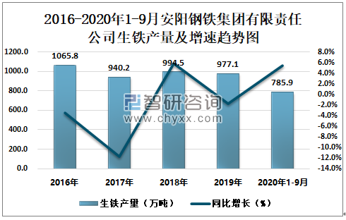2016-2020年1-9月安阳钢铁集团有限责任公司生铁产量及增速趋势图