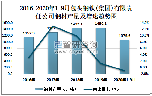 2016-2020年1-9月包头钢铁(集团)有限责任公司钢材产量及增速趋势图