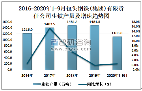2016-2020年1-9月包头钢铁(集团)有限责任公司生铁产量及增速趋势图