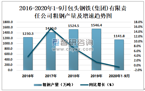 2016-2020年1-9月包头钢铁(集团)有限责任公司粗钢产量及增速趋势图