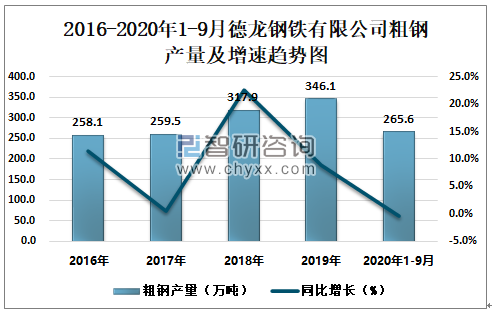 2016-2020年1-9月德龙钢铁有限公司粗钢产量及增速趋势图