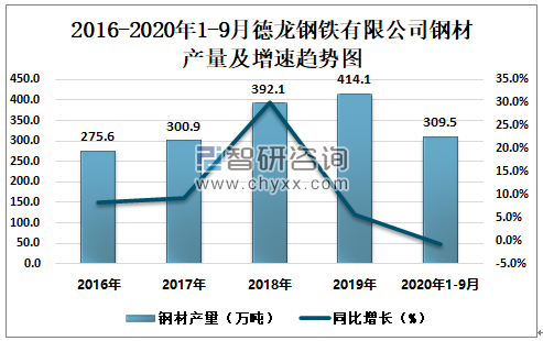 2016-2020年1-9月德龙钢铁有限公司钢材产量及增速趋势图