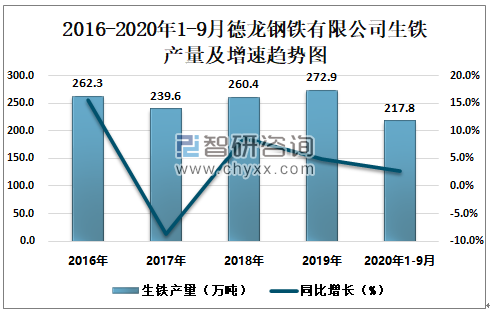 2016-2020年1-9月德龙钢铁有限公司生铁产量及增速趋势图