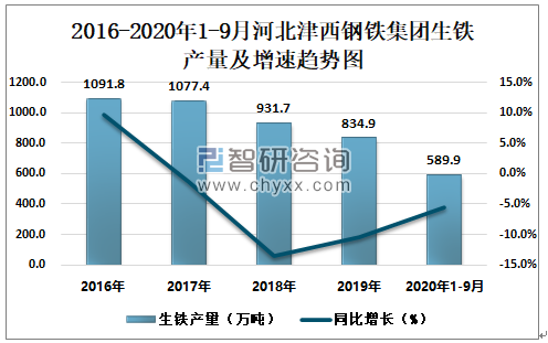 2016-2020年1-9月河北津西钢铁集团生铁产量及增速趋势图