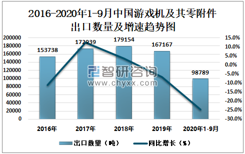 2016-2020年1-9月中国游戏机及其零附件出口数量及增速趋势图