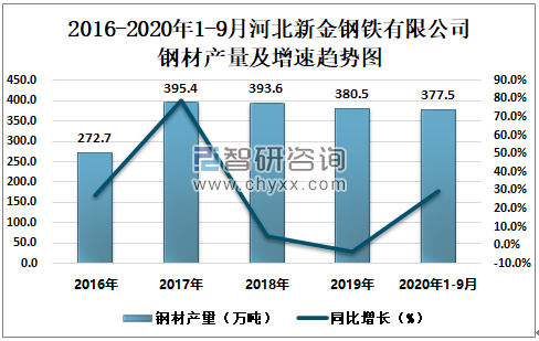 2016-2020年1-9月河北新金钢铁有限公司钢材产量及增速趋势图