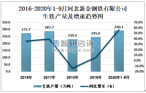 2016-2020年1-9月河北新金钢铁有限公司生铁产量及增速趋势图