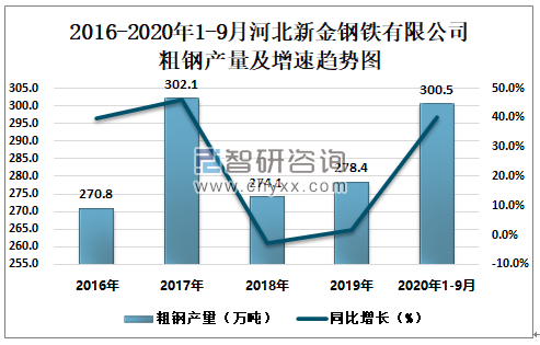 根据冶金工业信息中心数据显示:2020年1-9月河北新金钢铁有限公司钢材产量为377.5万吨,同比增长29.4%;粗钢产量为300.5万吨,同比增长40.1%;生铁产量为290.1万吨,同比增长56.9%。