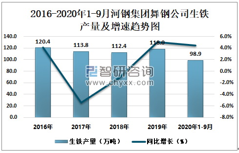 2016-2020年1-9月河钢集团舞钢公司生铁产量及增速趋势图